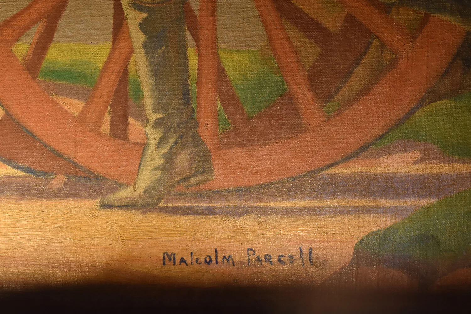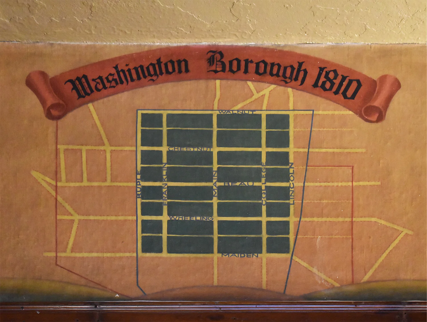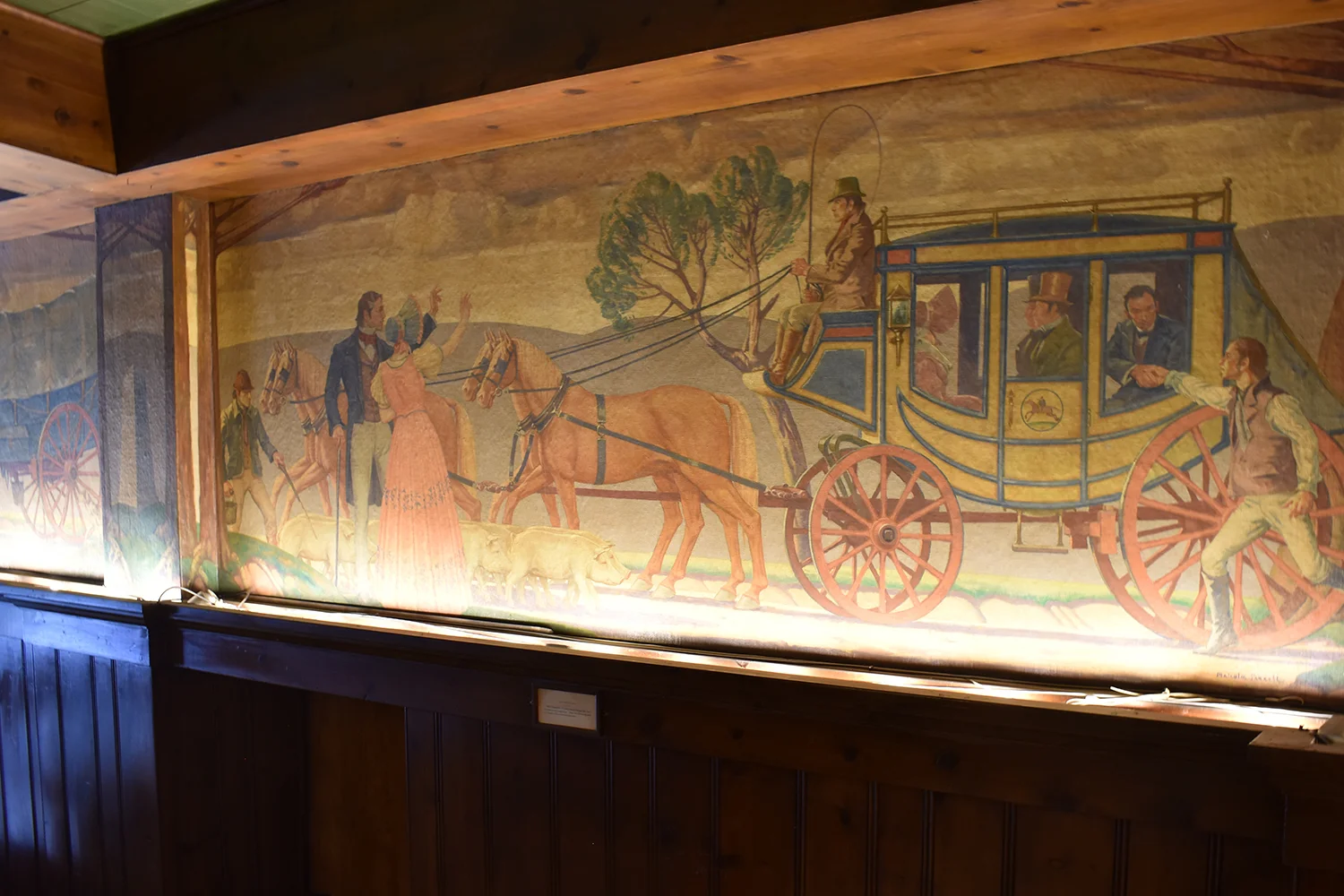 Malcolm Parcell created 6 murals for the Pioneer room. The Conestoga Wagon, Pony Express, Pack Horse, Stage Coach, Lafayette visits Washington, and Bradford’s Escape (not all murals shown on this website). Parcell lived in Washington, PA in a small white house he called Moon Lorn. The name was a reference to trees on the estate that obscured Parcell’s view of the moon. This odd house became part of his artistic legacy too. Parcell designed the place by adding new rooms onto an older structure and fashioning both interior and exterior into a romantic cottage of mainly colonial design.
